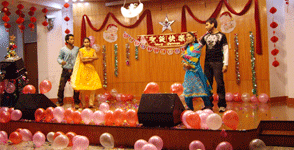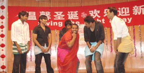 Before the party, Deputy dean of IEEC Professor Gao gave her best wishes to all the Indian students at the beginning of the party and presents for those who did well in the sport meeting and then the party hosted by Two Indian students began with and was full of enthusiastic Indian dances. Everyone enjoyed themselves very much because there are warm applauses and crazy shouting from the audience for each dances. There are also two Chinese students giving their performance on the party. Indian students had also played games of self-revealing, during which the hostess read the sincere words being prepared in advance. The best and most wonderful part of the party is the game of exotic costumes, which Ms. Gao and Ding also took part in and fully exhibit their imaginations. All the audience were greatly amazed by the creativity and dexterous practical abilities.
