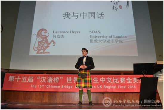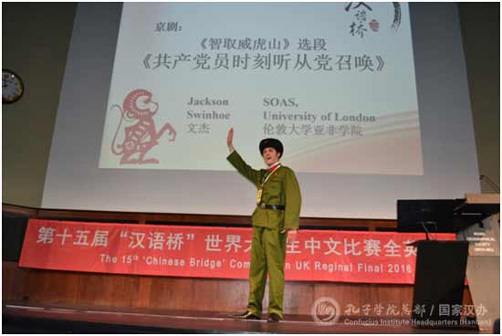 自2016年2月第十五届“汉语桥”世界大学生中文比赛全英大区赛拉开序幕以来,共吸引了全英近40所高校的百余名学生参加。最终来自17所高校的 31名选手进入复赛,通过了严格的复赛评审,共有来自阿伯丁大学、利兹大学、伦敦大学亚非学院、兰卡斯特大学和诺丁汉大学等10名选手进入决赛。经过以 “梦想成就未来”为主题的自命题演讲、并围绕中国国情与文化的知识问答以及才艺表演等环节的比拼,来自伦敦亚非学院的文杰(Jackson Ronnie Swinhoe)和何安杰(Laurence Andrew James Heyes)分获当晚决赛的特等奖和一等奖。