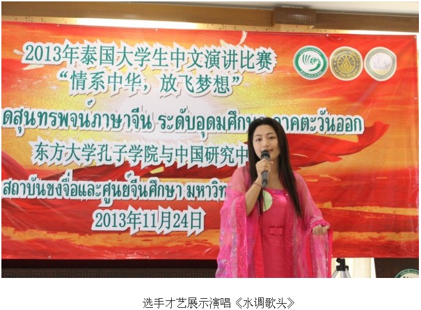 2013年11月24日,泰国东方大学孔子学院与中国研究中心合作举办的“情系中华·放飞梦想”中文演讲大赛圆满落幕。来自清迈皇家大学、萱素南他皇家大学、曼谷拉差蒙埋科技大学、兰拍帕尼皇家大学、玛哈沙拉坎大学、斯巴顿大学春武里校区等院校的选手们积极参加了当天的决赛。泰国岱密中学孔子课堂长施彤老师、曼松徳大学孔子学院公派教师陈国灯、东方大学人文学院中文系普墨琳博士,以及东大孔院泰方院长符丽珠博士和中方院长陈素云老师作为评委见证了整场比赛。