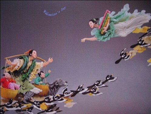 The ox was actually an immortal from the Heaven. He made mistakes in the Heaven and was punished as an ox in the Earth. One day, the ox suddenly said to the cowherd, "You are a nice person. If you want to get married, go to the brook and your wish will be come true." The cowherd went to the brook and saw all 7 pretty daughters of Emperor came down from Heaven and took a bath in there. Fascinated by the youngest and also the most beautiful one, he took away her fairy clothes secretly. The other six fairies went away after bath. The youngest couldn't fly back without her fairy clothes. Then the cowherd appeared and told her that he would not return her clothes unless she promised to be his wife. After a little hesitation and with a mixture of shyness and eagerness, she agreed to the request from this handsome man. So they married and had two children two years later.