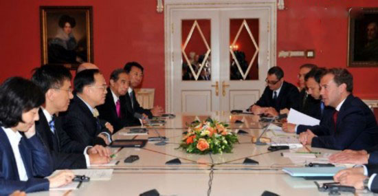 Russian President Dmitry Medvedev (1st R) meets with Donald Tsang Yam-Kuen (3rd L), chief executive of China's Hong Kong Special Administrative Region, in Moscow, capital of Russia, Aug. 31, 2010. (Xinhua)