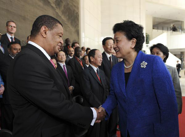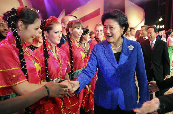 Chinese State Councilor Liu Yandong shakes hands with overseas students after a performance in Beijing, capital of China, Sept. 29, 2010, to celebrate the 60th anniversary of New China's hosting of overseas students. |