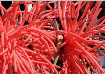 A dancer waits amidst balloons for the opening ceremony of the 13th Beijing International Tourism Festival at Qianmen Commercial Street in Beijing, September 17, 2011.