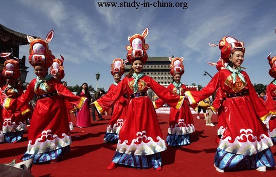 Performers dance ahead of the opening ceremony of 13th Beijing International Tourism Festival at Qianmen Commercial Street in Beijing, September 17, 2011.