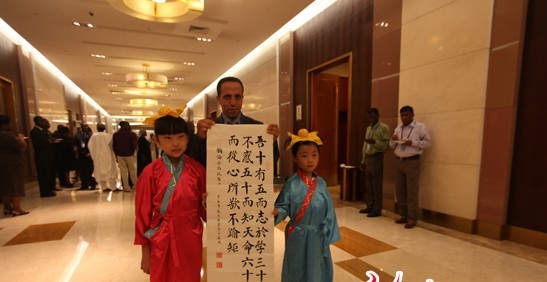 Meeting with three educated and lovely "little Confucius", Mr. Tshewang Tandin and Mr. Merck Tal Hamuduoni were happy too. They held calligraphic works to have a photo with three "little Confucius". To show his gratitude, Mr. Tshewang Tandin also presented "little Confucius" a gift from Bhutan—a fine magazine on education.
