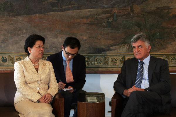 Greek Parliament President Philippos Petsalnikos (R) meets with Chen Zhili, vice chairwoman of the Standing Committee of the National People's Congress (NPC), China's top legislature, in Athens, Greece, Sept. 9, 2010. (Xinhua/Marios Lolos) |