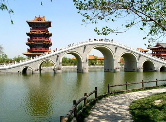 Qingming Riverside Landscape Garden, located on the western shore of the beautiful Longting Lake in Kaifeng City, is a grand historic cultural-themed park. It was modeled after the painting "Qingming Riverside Landscape" by Zhang Zeduan, a famous painter in Northern Song Dynasty (960-1127) of ancient China. The garden was built in July 1992 and opened to the public in October 1998. The most famous scenic spots in the park include the Imperial Garden, Rainbow Bridge and Fuyun Pavilion.