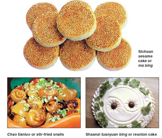 In Shaanxi Province, there's a speciality cake or bun known as tuanyuan mo (团圆馍), meaning "reunion bun." It's very large and can be shared by a family. It contains sesame filling and can be seasoned with sesame oil, salt or sugar.