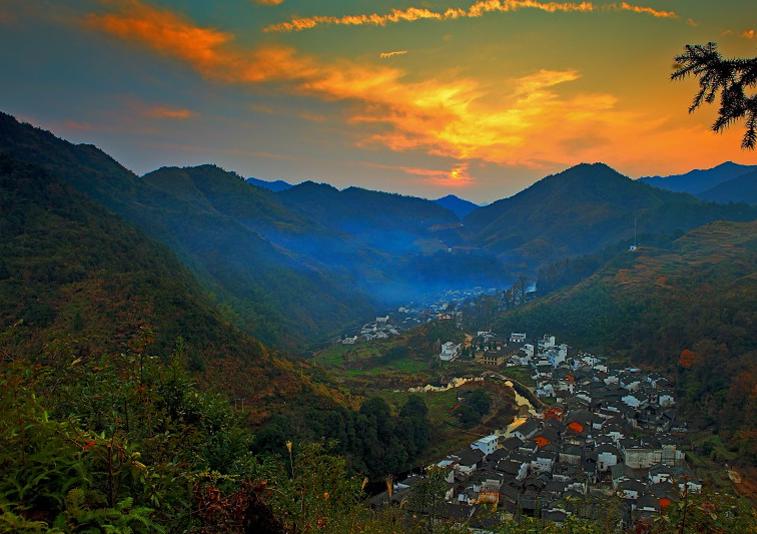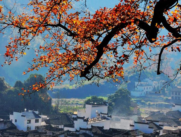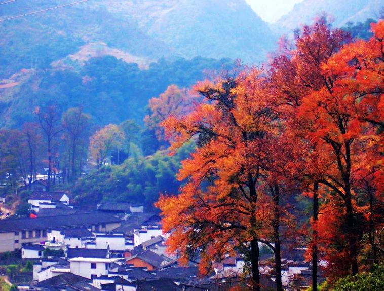 Wuyuan county in Jiangxi Province is famous for the large pieces of rape flowers. But in fact, it becomes more poetic when autumn comes. In late autumn, Changxi Village is shore with deep and vivid tints. The maple trees growing in the front and back of the village turn to burning red. The tall trees contrast finely with the Mau Tou Wall (Horse Head Wall). The red maple leaves, white walls and black tiles blend into a unity, making a unique sight in this ancient village.