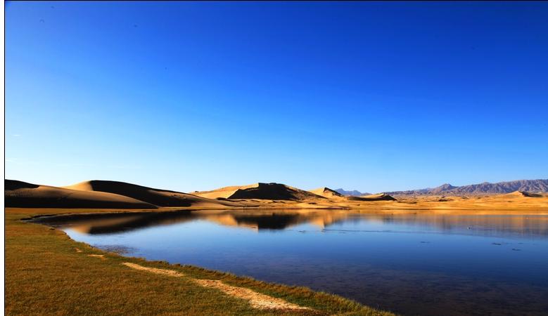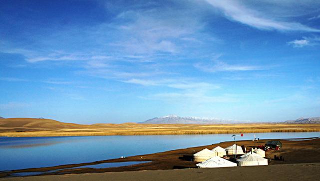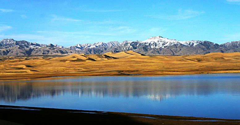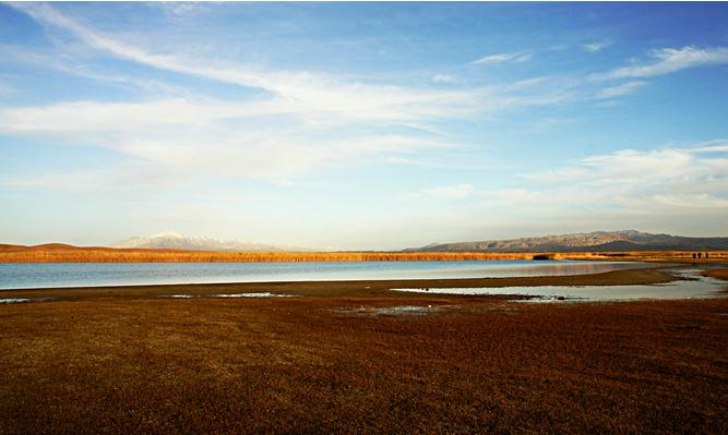 Photo shows the lake known as the "Golden Sea", 80 km southwest of the Wulan County Seat, Haixi Mongol and Tibetan Autonomous Prefecture, northwest China's Qinghai Province. The lake covers an area of 0.45 sq km, with two rivers originating from it and flowing toward southeast and southwest, respectively. The lake is surrounded by desert to the west and northwest and reeds to the east and southeast.
