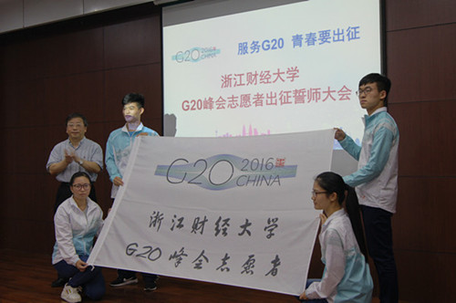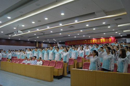 The principal of the university made a speech to encourage the students to take part in the service for the G20. He emphasized the importance to remember the mission and show the elegance of the university. On behalf of the student representatives in Zhejiang University of Finance and Economics, not only will the volunteer represent the charm of their university, but the Chinese youth. So they should strengthen the sense of glory and mission and value the chance to improve themselves.