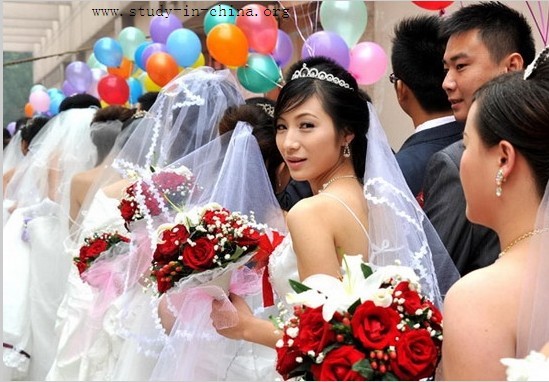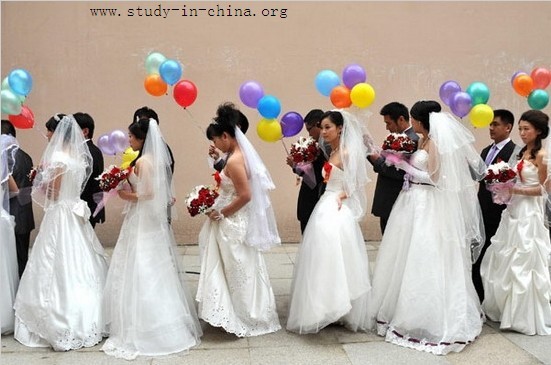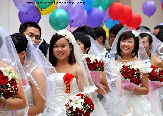 Couples take part in a free group wedding ceremony in Jinan, capital of East China's Shandong province, Oct 10, 2011. The wedding was held to promote austere ways of getting married, and gave priority to soldiers, migrant workers and financially strapped families. Altogether 60 couples took part in the ceremony.