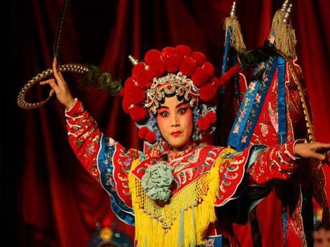 Beijing ( Peking ) opera is a national treasure with a history of over 200 years. It can date back to the 55th year of the reign of Emperor Qianlong of the Qing Dynasty(1790) when the four big Huiban opera Troupes entered the capital and mixed with Kunqu opera, Yiyang opera, Hanju opera and Luantan in Beijing's thearetical field at the time. With over half a century of mixture and combination of various kinds of opera there came the present Peking ( Beijing ) opera, the most impressive kind of opera in China. It is rich in repertoire with large number of artists of performance and of audiences. It has a profound influence in China. For western ears, the Peking Opera might need getting used to. The story is sometimes difficult to follow. It is very colourful bright and extremely noisy and bears absolutely no resemblance to western opera. Peking opera - a number of combined stylized actions: Beijing Opera is a number of stylized action, including singing, dancing, dialogue and acrobatic fighting to tell a story or present different characters and their feelings of happiness, anger, sorrow, surprise, fear and sadness. In Peking opera there are four main types of roles: sheng (male) dan (young female), jing( painted face,male), and chou (clown, male or female). The characters may be loyal or treacherous, beautiful or ugly, good or bad, their images being vividly presented. The rich repertoire of Peking Opera: Beijing Opera is mainly about the tales of successive dynasties regarding important historical events, emperors, ministers and generals, geniuses and great beauties, from the ancient times to Yao, Shun, Yu, the Spring and Autumn Period, the Warring States Period and the dynasties of Qin, Han, Sui, Tang, Song, Yuan, Ming, Qing for 5000 years. The music of Peking Opera: The music is that of the "plate and cavity style". With harmonious rhythms, its melody is graceful and pleasing to the ears. The melody may be divided into two parts: "Xipi" and "erhong". The chief patterns are guiding pattern, original pattern, slow pattern, quick pattern. The performance is coupled by a tune played on wind instruments, stringed instruments and percussion instruments. The chief musical instruments is jinghu which is a two-stringed bowed instrument with a high register, yueqin which is a four-stringed plucked instrument with a full-moon-shaped sound box, Sanxian which is a three-stringed plucked instrument, suona horn, flute drum, large-gong, cymbals, tiny-gong, etc. The costumes in Peking opera: The costumes are graceful, magnificent, elegant and bright. As the conventional Chinese pattern are used, the costumes are of a high value. Peking Opera costumes show the beauty of traditional Chinese embroidery: surface embroidery with gold or silver threads; woollen embroidery with silk or gold threads, among many others. Every costume is a masterpiece of art and craft. One costume with elaborate designs and patterns may take a handicraftsman months or even years to finish, and the best are indeed priceless. The types of facial make-ups in Peking opera: The types of facial make-ups are rich and various, showing various characters and remarkable images, therefore they are highly appreciated. Moreover there are numerous fixed editions of facial make-up. For the painted role, the different colors of the faces depict different characters and personality. Yellow and white shows cunning, red represents uprightness and loyalty, black depicts valor and wisdom, blue and green stands for the vigorous character of rebellious heroes and gold and silver represent mystic or super-natural things. The most famous actor - Mei Lanfang: He is the most popular Beijing Opera singer and he even had some performances in Japan,Europe, and USA. With his voice, movements, style, he played female roles perfectly. It is a good idea to visit the Residence of Mr. Mei Lanfang (1894 - 1961). Open: daily 9:00 -12: 00 a.m. and 1:00 - 4:00 p.m. (except Monday). Beijing Opera Major Houses: Huguang Huiguan Ancient Opera Building Liyuan Theatre Chang'an Grand Theatre Zhengyici Theatre