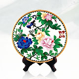The product, as a cloisonne-made disc, accompanied with the pattern of flower and birds which are made from enamel shows simpleness. The main body of disc, such as peonies with different colors----green leaves and flower. The peonies have the features of contending with each other to show their charm and enchanting beauty. In the sun, bird with blue feather and black trail is standing on the branch of tree and combing its feather. The colorful butterflies are dancing between flowers. They demonstrate freedom and swift. The white disc as background united spun gold cloud, the product will be elegant and dignified.