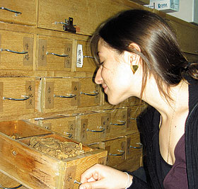 UConn student Ana Charalambides looks at herbs in the traditional Chinese medicine pharmacy in Peking University Third Hospital. |