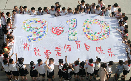 Students show a drawing at Huanfeng Primary School in Hanshan County, east China’s Anhui Province, Sept. 9, 2008. The students put their hand prints on a huge cloth to form number ’9.10’, indicating the date of Chinese Teacher’s Day, as a gift for their teachers. |