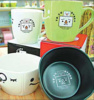 Bowls and mugs feature patterns inspired by the Jiong character.