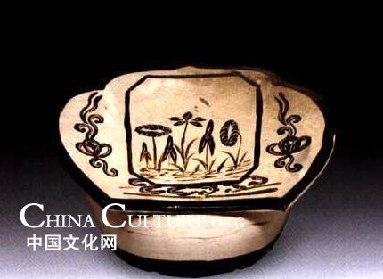 White glaze black lotus porcelain pillow, Cizhou Kiln of Song Dynasty, preserved at Shaanxi History Museum. |
