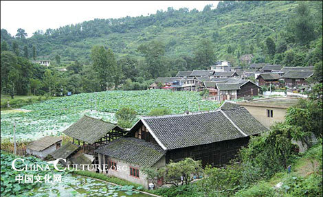 Traditional houses of Bouyei people are built around a large lotus lake in Ping village. |